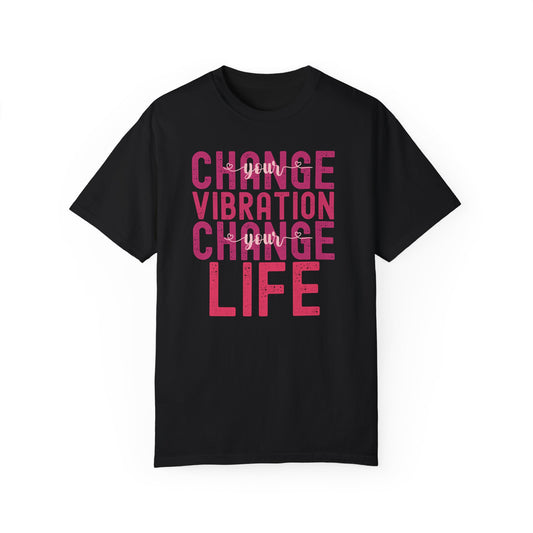 Change Your Vibration Change Your Life with pink hues (Comfort Colors 1717 T-Shirt) for women and men