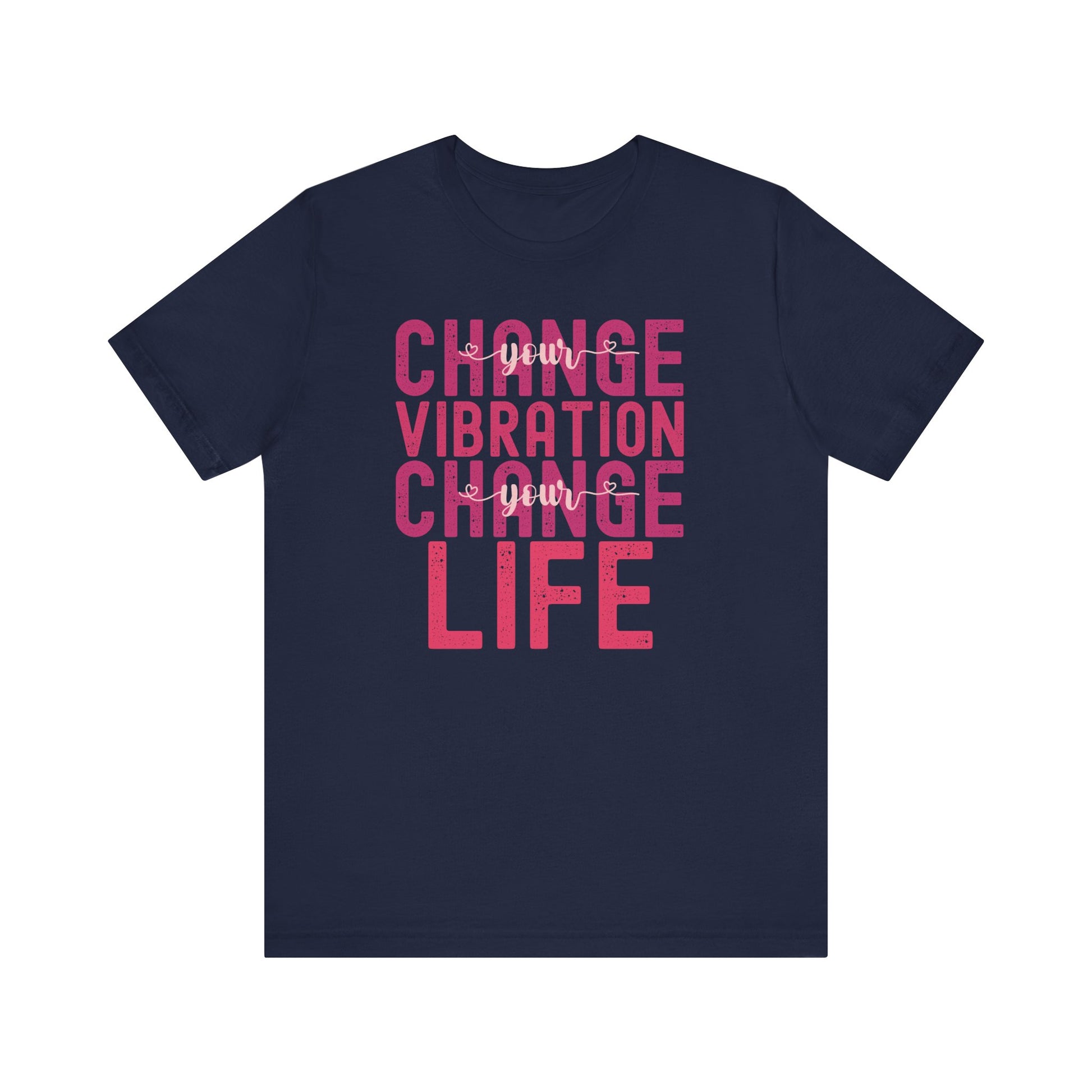 If you, "change your vibration, change your life," is a mantra we proudly display in pink hues on our Bella Canvas 3001 fashion-fit t-shirt. This versatile shirt is suitable for any occasion, featuring side seams and a form-fitting design that ensures a presentable look. The tailored-fit cut drapes naturally over the body, highlighting your shape. Crafted from 100% airlume combed and ring-spun cotton, this t-shirt is a lightweight, premium-fit, breathable, and incredibly soft tee. Its light material keeps you cool in warm weather and allows for easy layering in colder months. Express delivery is available for our Bella Canvas 3001 retail fit T-shirt in white, gray, navy, and black.